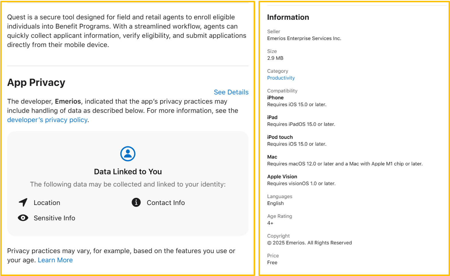 Agents will also find a summary of the Quest app as well as information related to the Size of the application, the Device specifications and the language, among others.