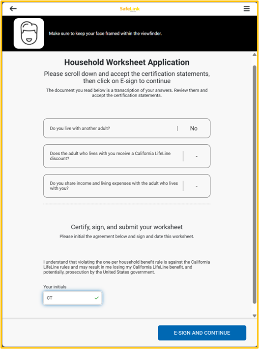 On the other hand, if the answer is No, the summary section will be prompted, where the applicant will have to provide their initials to finish the household worksheet process.