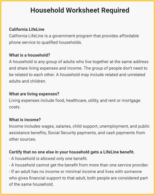 The Household Worksheet process will be mandatory in some states, and in some other cases it will have to be completed because the address seems to be already in use by another Lifeline customer.