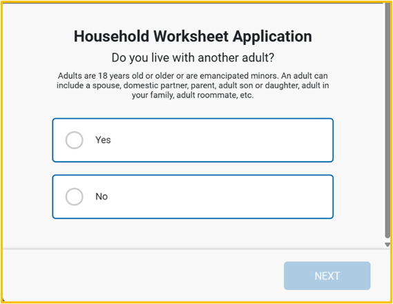 In the first question, applicants will have to indicate if they live with another adult. If the answer is NO, the process will be finished, because there is no other person living in the same household receiving the benefit.