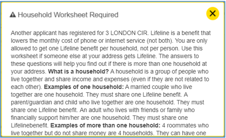 If the applicant answers with a Yes to the third question, the agent will not be able to apply for the service, because there is already a Lifeline discount in the household: