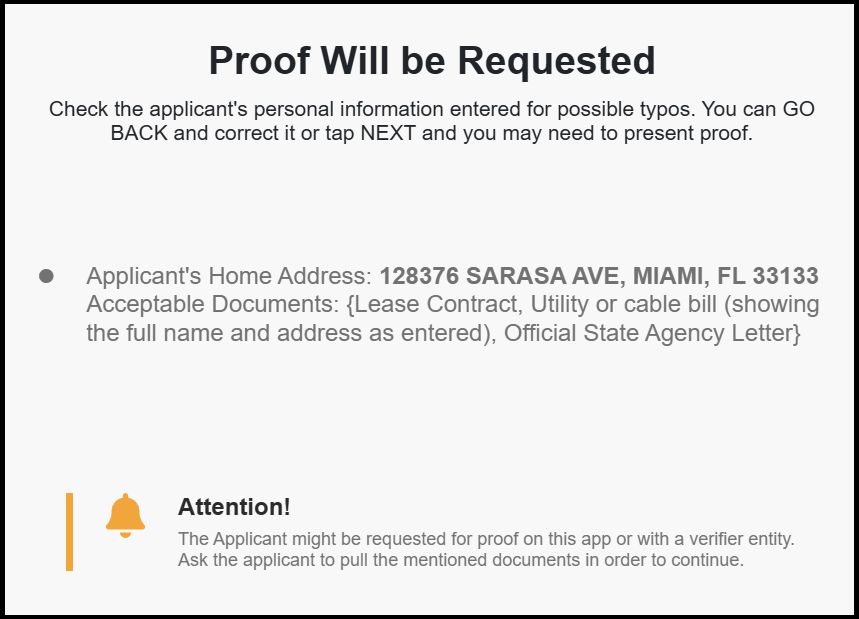 If the input information is correct but the validation warning persists, after three attempts, a new pop-up will appear informing Street Team Agents that the customer will have to submit proof of address. They will click on CLOSE and continue creating the application. The shipping address field will become mandatory and the applicant will have to provide a valid shipping address in order to continue with the enrollment: