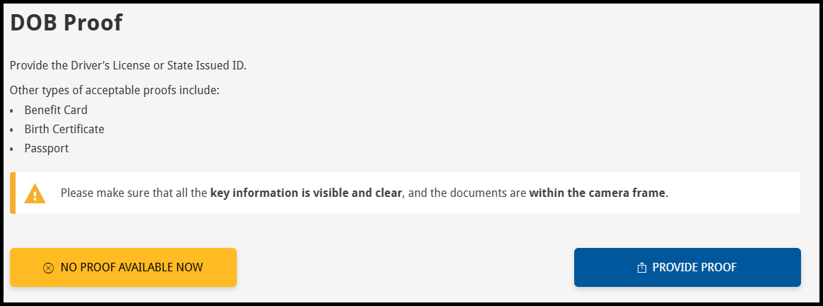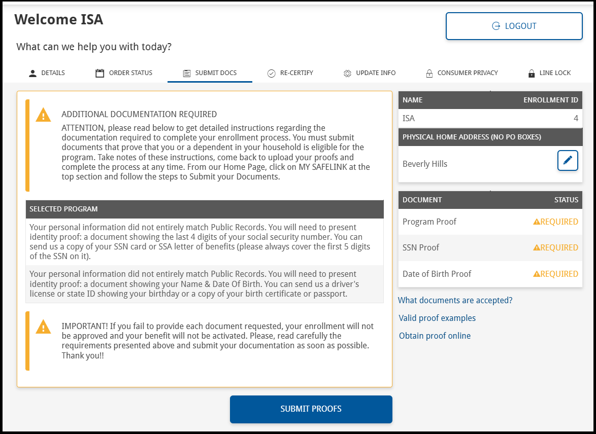 By accessing the Submit Documentation section, applicants will be provided with instructions to submit any pending proofs. To do so, the SUBMIT PROOFS button should be pressed.