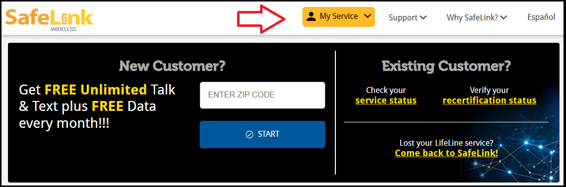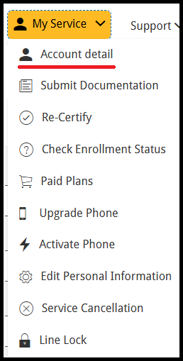 This section contains several options that will enable customers to review information related to their account. To access this section, they need to click on the My Service button located at the top of the homepage.