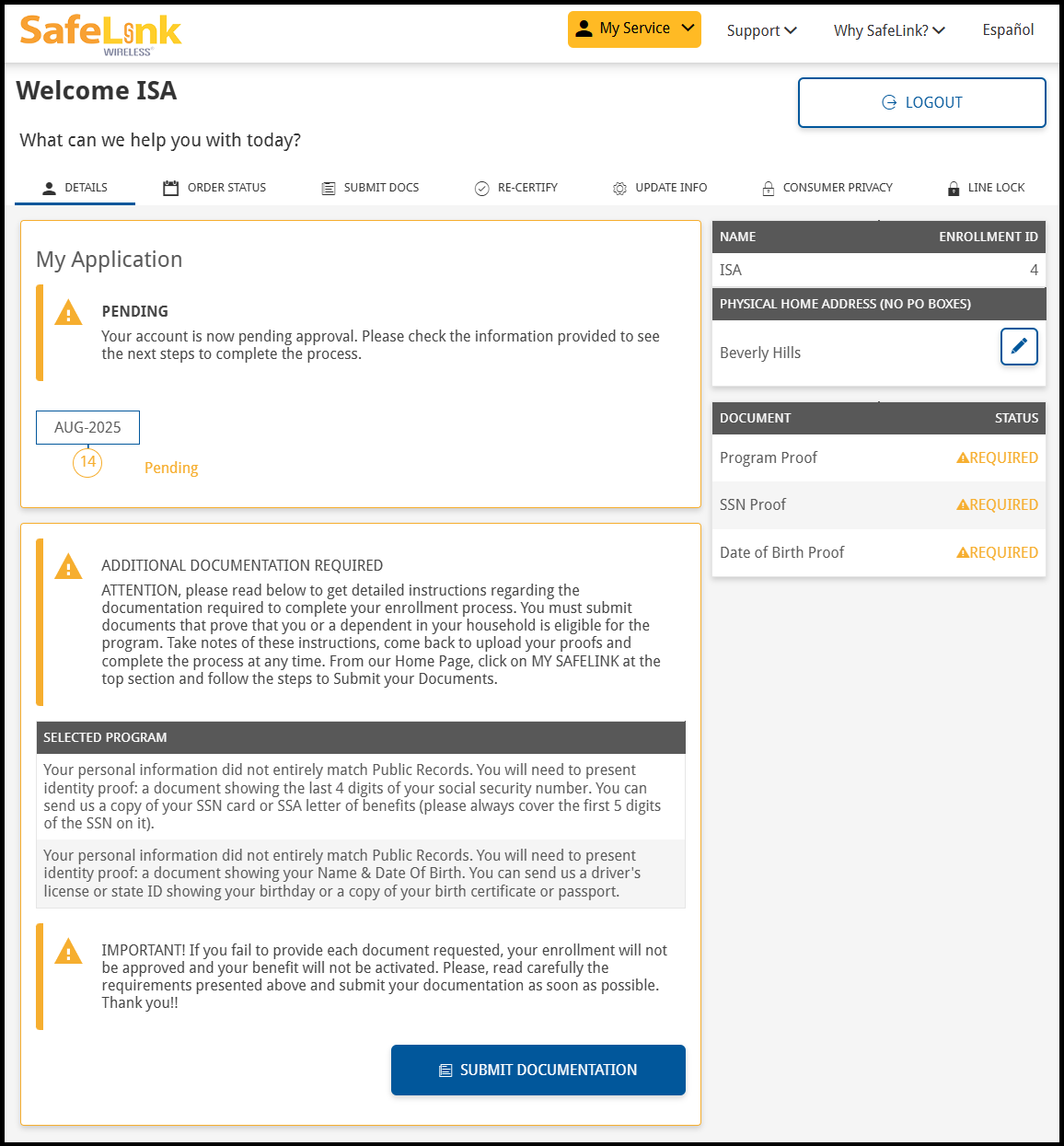 Apart from displaying the account status and some of the customer's personal information, this section will inform if documents are pending submission. Instructions will be provided for applicants to know how and which documents they need to upload. To do so, the SUBMIT DOCUMENTATION button should be pressed.