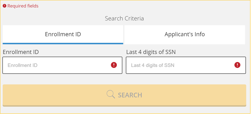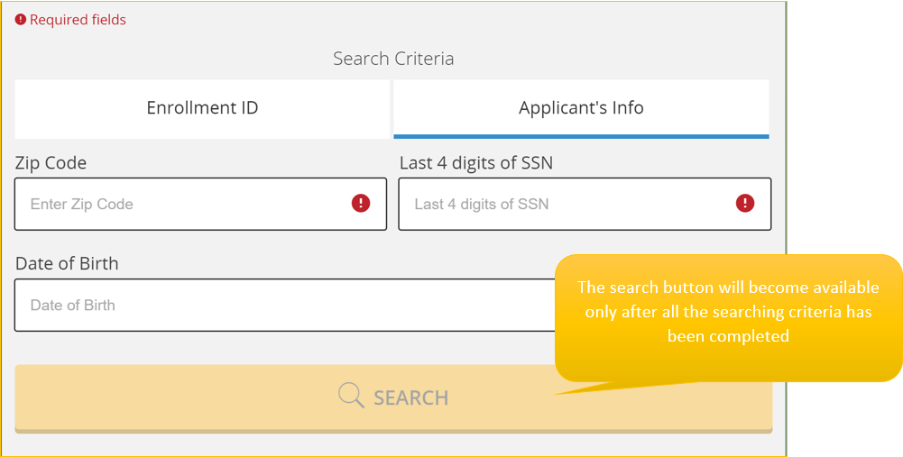 The search button allows the agent to look for a specific enrollment using a combination of two pieces of information: