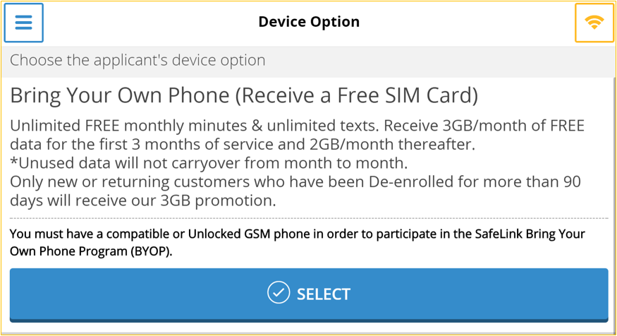 This option is available for customers that already have a device and want to use it with a Safelink Wireless SIM, along with its Lifeline Benefit.